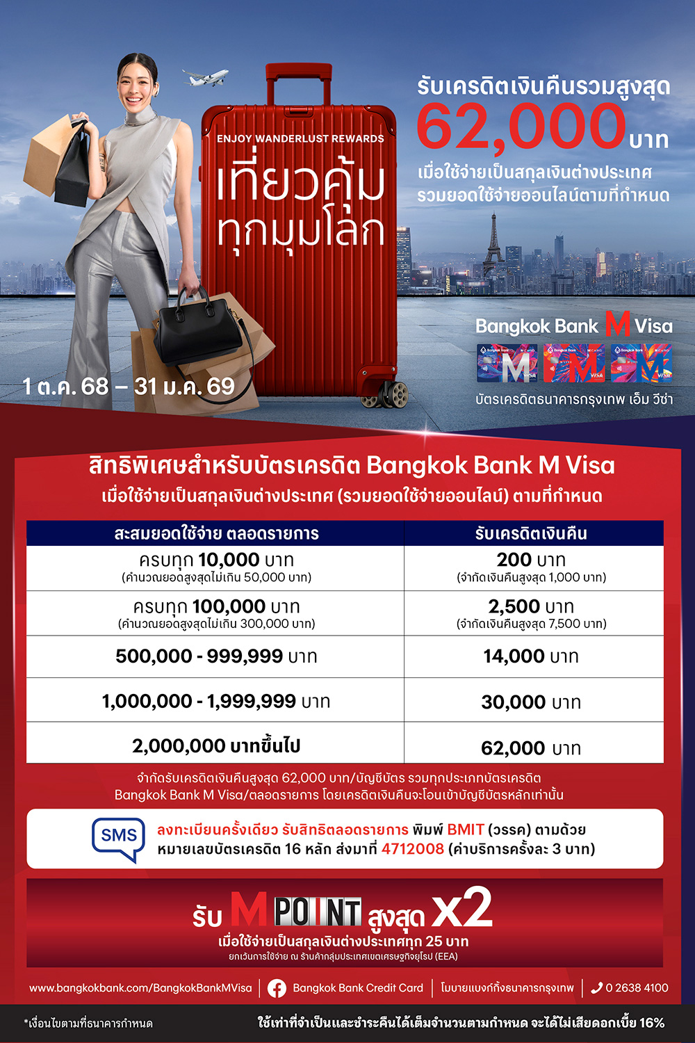 เที่ยวคุ้มทุกมุมโลก หรือ ช็อปออนไลน์ เป็นสกุลเงินต่างประเทศ กับบัตรเครดิต Bangkok Bank M Visa รับเครดิตเงินคืนรวมสูงสุด 62,000 บาท*