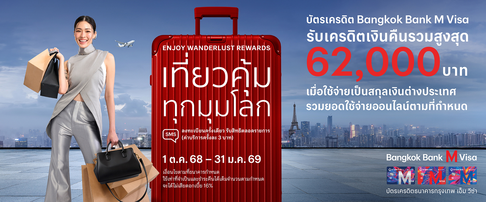 เที่ยวคุ้มทุกมุมโลก หรือ ช็อปออนไลน์ เป็นสกุลเงินต่างประเทศ กับบัตรเครดิต Bangkok Bank M Visa รับเครดิตเงินคืนรวมสูงสุด 62,000 บาท*