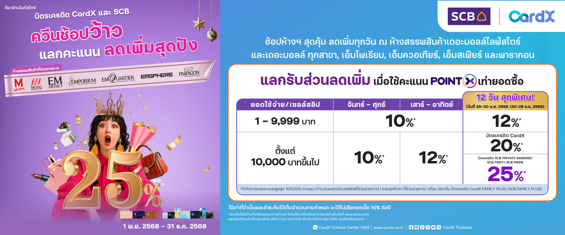 บัตรเครดิต CardX แลกทุก 1,000 คะแนน รับส่วนลด 100 บาท
