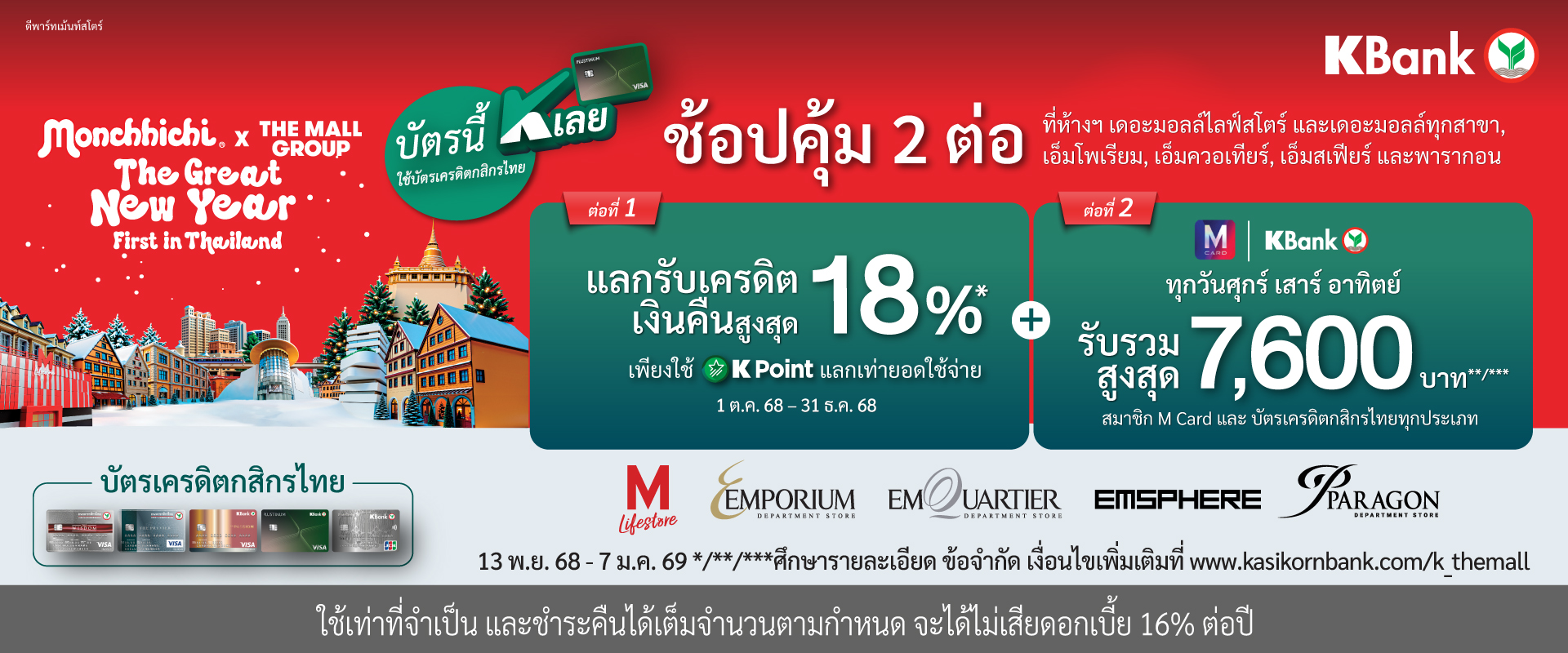 (2) จำกัดรับ M Cash Coupon สูงสุด 3,800 บาท/ท่าน/ทุกสาขา/ตลอดรายการ, จำกัดรวม 2,339 สิทธิ์/ทุกสาขา/ตลอดรายการ, นำใบเสร็จ เซลล์สลิป และบัตรเครดิตมาลงทะเบียนรับ M Cash Coupon ภายในวันและสาขาที่ทำรายการ ณ จุดแลกรับของสมนาคุณที่ห้างฯ กำหนด, สาขาเอ็มโพเรียม เอ็มควอเทียร์ และเอ็มสเฟียร์ สามารถรวมใบเสร็จกันได้, ใบเสร็จหรือเซลส์สลิปบัตรเครดิตที่ใช้ลงทะเบียนรับสิทธิ์ไปแล้วไม่สามารถนำไปใช้รับสิทธิ์ร่วมกับรายการส่งเสริมการขายอื่นของบัตรเครดิตกสิกรไทยได้อีก, M Cash Coupon หมดอายุการใช้งานในวันที่ 31 มี.ค. 69, สงวนสิทธิ์การใช้ M Cash Coupon สำหรับซื้อสินค้าในครั้งถัดไปคู่กับบัตรเครดิตธนาคารกสิกรไทยเท่านั้น