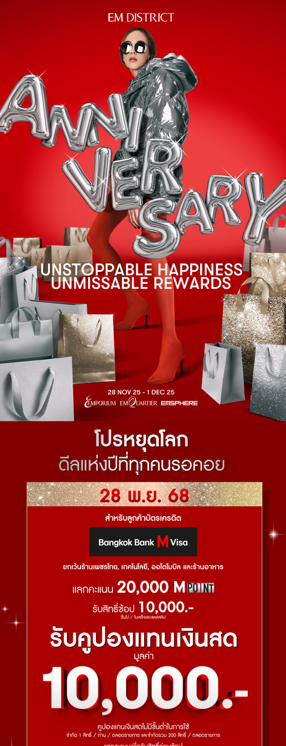 • หากรับสิทธิ์โปรโมชันนี้แล้ว จะไม่สามารถรับสิทธิ์โปรโมชัน ช้อปครบ 20,000 บาท ขึ้นไป / ใบเสร็จและเซลล์สลิป รับคูปองแทนเงินสด 10,000 บาท ในวันที่ 28 พฤศจิกายน 2568 ช่วงเวลา 16.00 น. – 22.00 น. ได้อีก