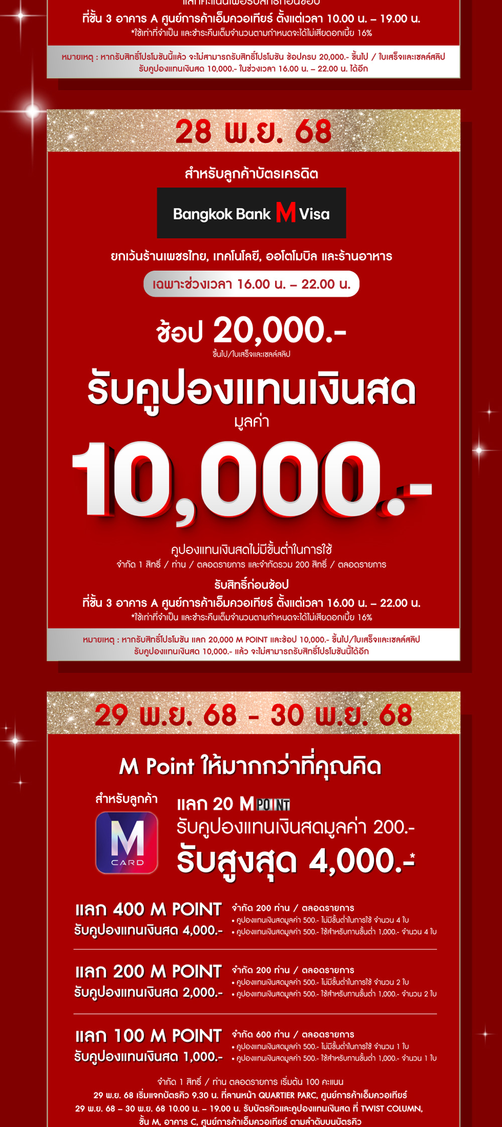 เงื่อนไขการลงทะเบียนรับบัตรคิว โปรแลกคะแนน 20,000 M POINT รับสิทธิ์ช้อป 10,000 บาท / ใบเสร็จและเซลล์สลิป รับคูปองแทนเงินสด 10,000 บาท เฉพาะบัตรเครดิต Bangkok Bank M Visa
