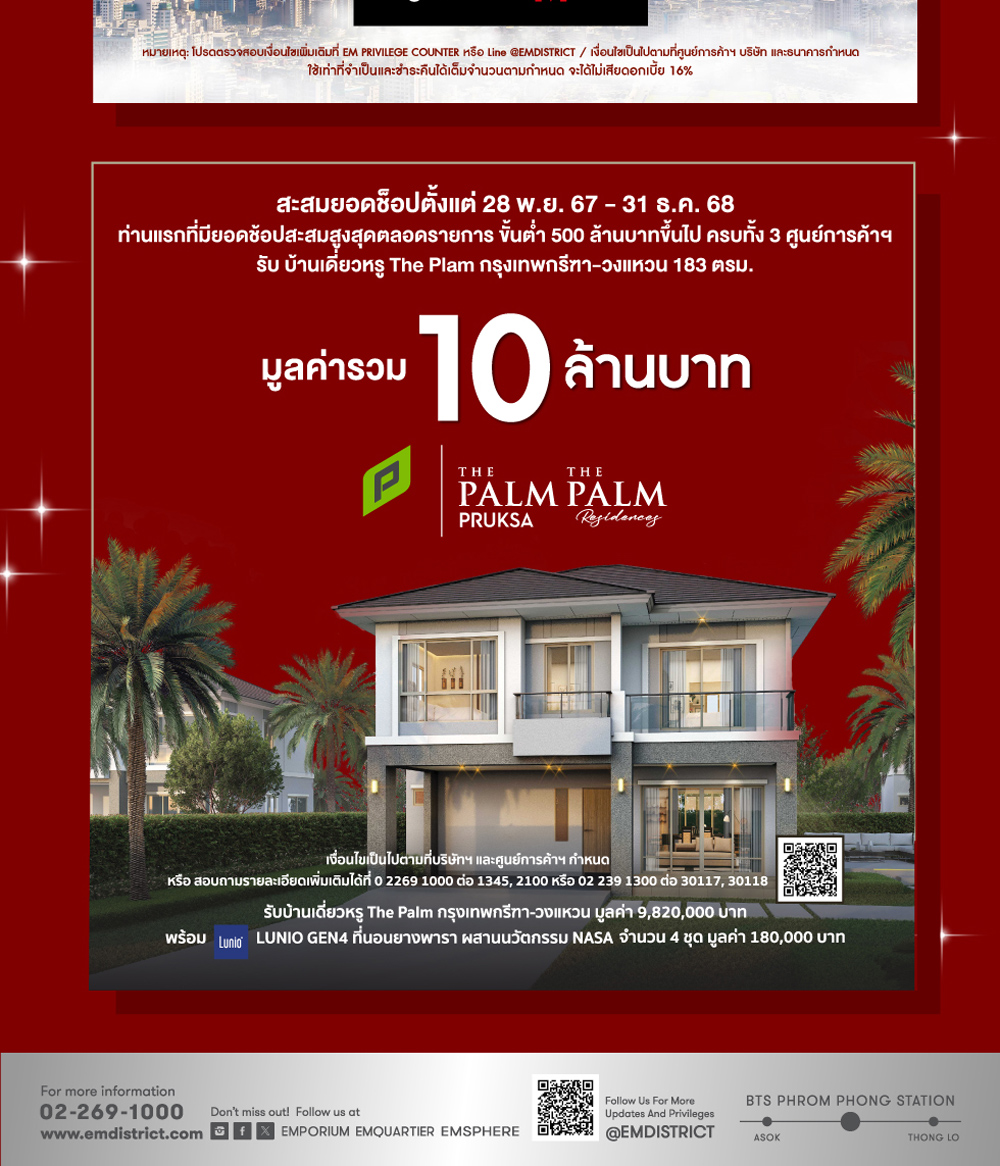 • สามารถมาแลกรับคูปองแทนเงินสด ที่เคาน์เตอร์ EM PRIVILEGE ชั้น M ศูนย์การค้าเอ็มโพเรียม, เอ็มควอเทียร์, เอ็มสเฟียร์ ได้ตั้งแต่เวลา 10.00 น. – 19.00 น.