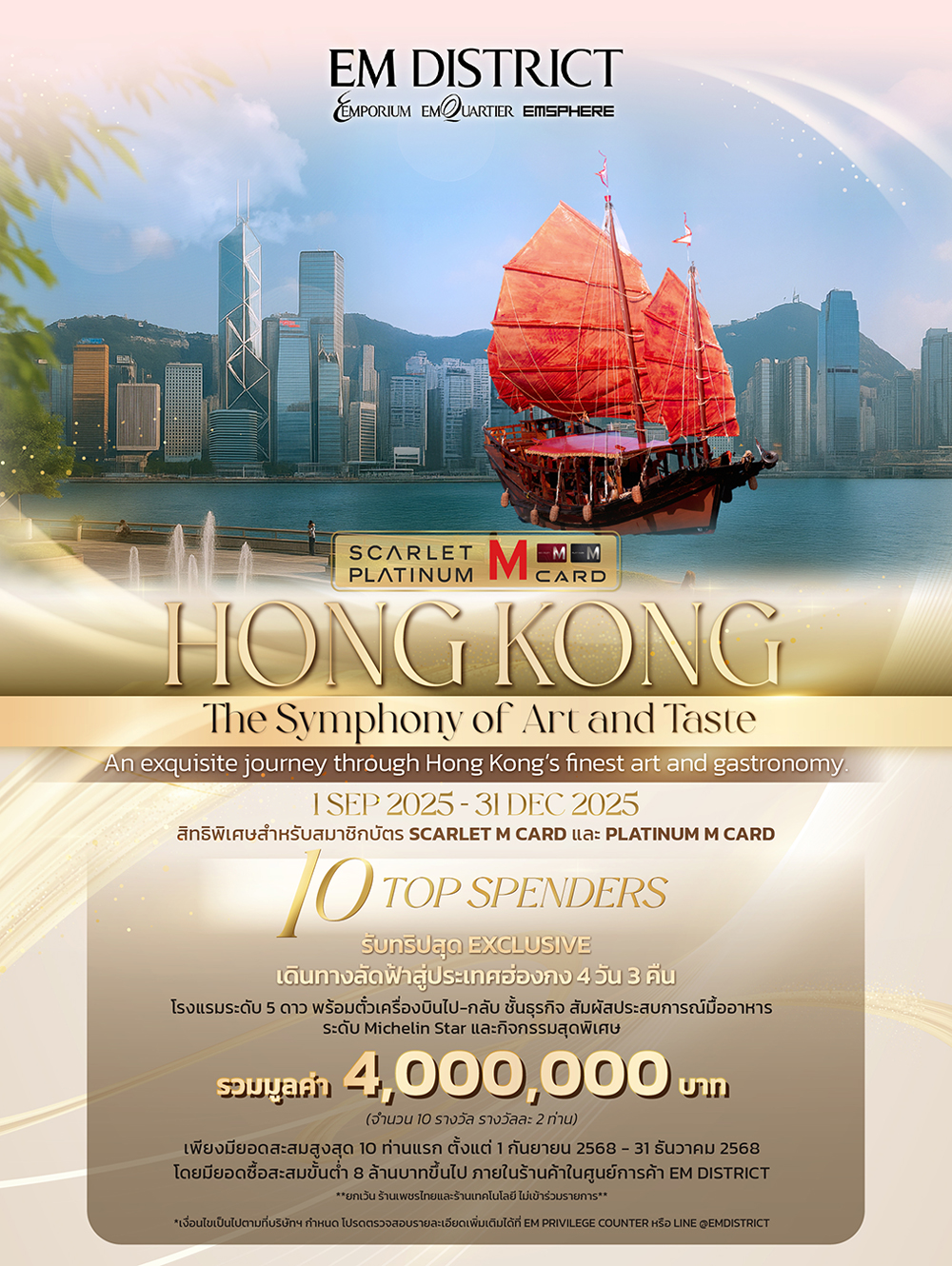 - ยอดสะสมที่นำมาคำนวณต้องเกิดจากการสะสมยอดซื้อเฉพาะที่ ศูนย์การค้า เอ็มโพเรียม, เอ็มควอเทียร์ และเอ็มสเฟียร์ เท่านั้น